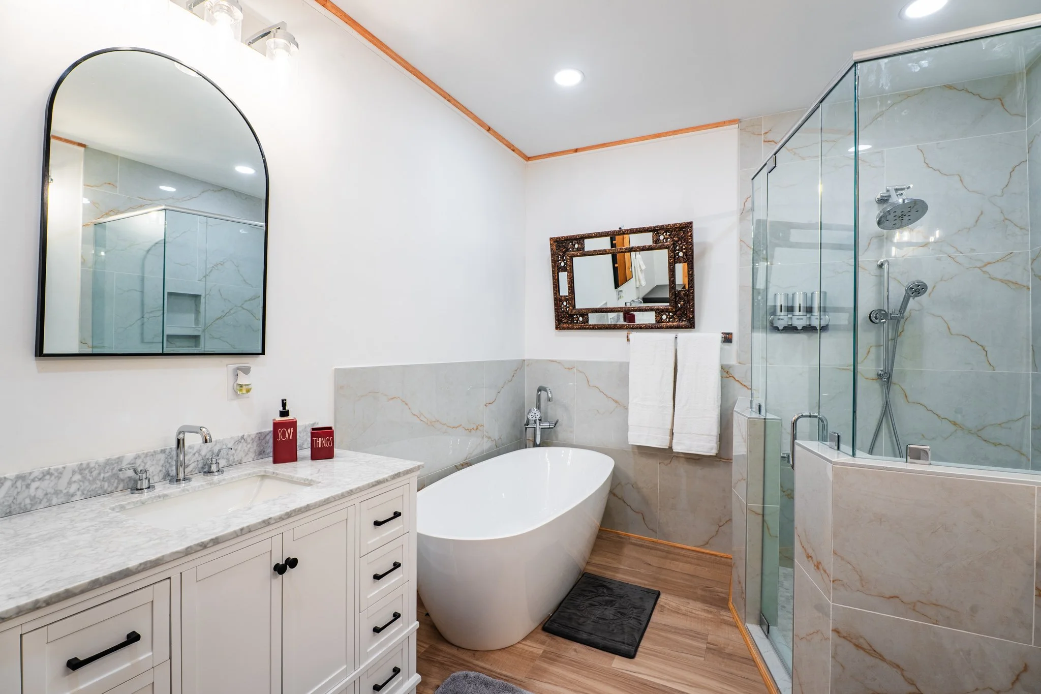 The main-level bathroom is a spa-inspired retreat—spacious, serene, and designed to impress. With two vanities, a deep soaking tub, and a large tile shower with luxurious finishes, it’s a space that invites you to slow down and recharge. Whether you're prepping for the day or unwinding at night, every detail is crafted to elevate your stay with comfort, style, and restorative calm.